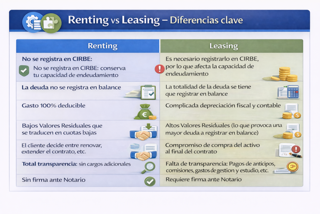 Mientras el leasing genera una financiación asociada a un activo, el renting se trata como gasto operativo, lo que puede contribuir a una estructura financiera más ligera y flexible.